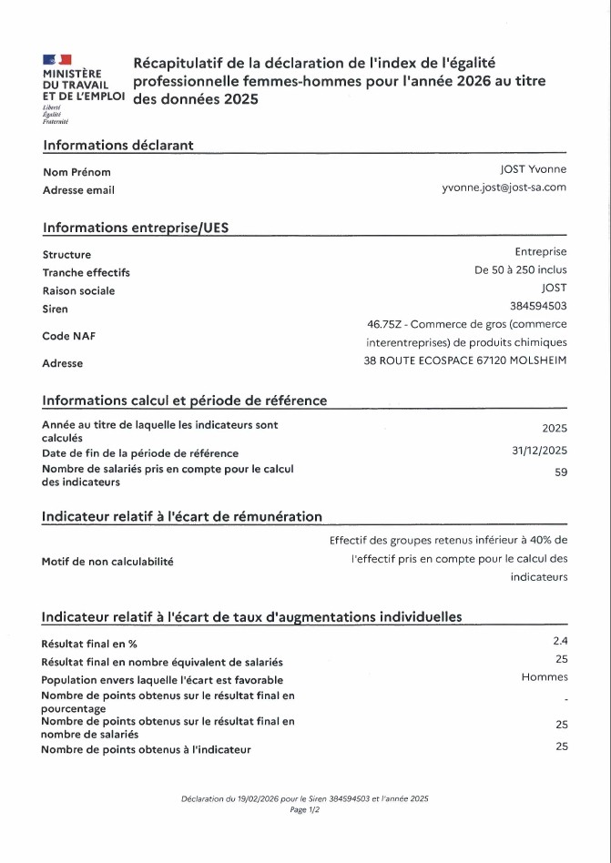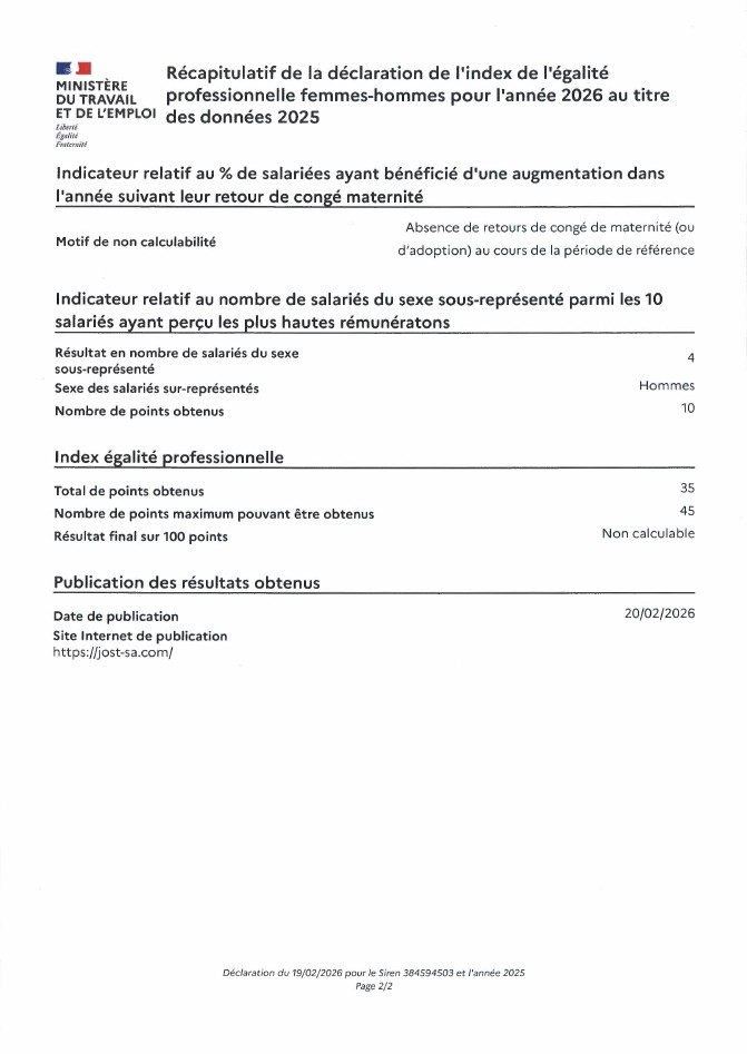 Récapitulatif de l'index de légalité professionnelle femmes-hommes pour l'année 2026 au titre des données 2025