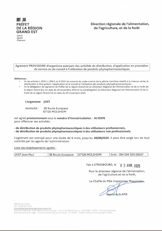Agrément AL 10376 Distribution Produits Phytosanitaires